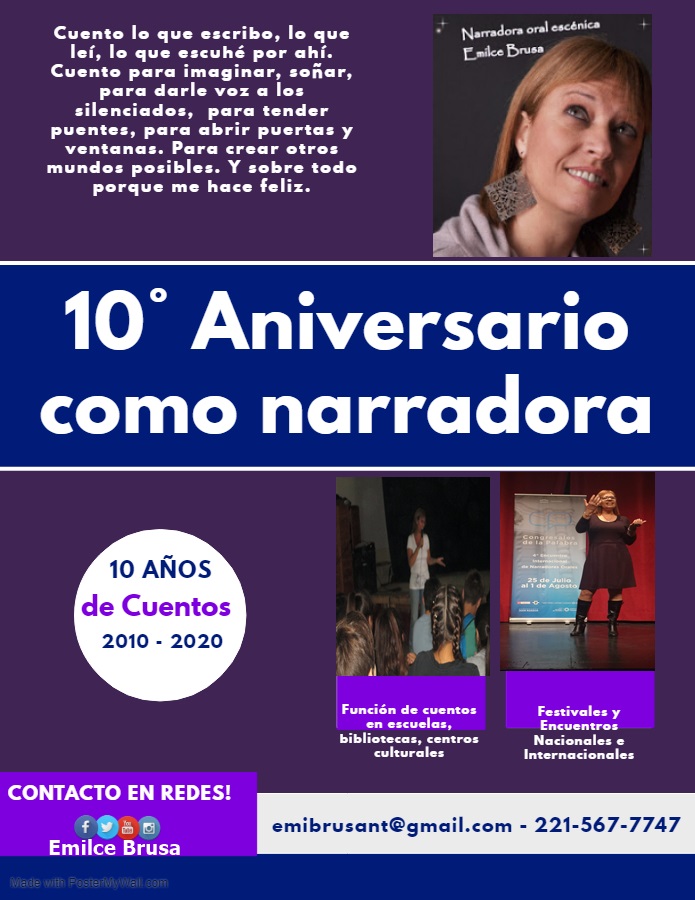 Pero estoy de festejo! 10 años de cuentos, 10° Aniversario como narradora. Por lo cual sigo pensando en varios proyectos que de a poco serán posibles hacerlos realidad. Uno es dar a conocer mi página web que está a punto de nacer y desde ese sitio ofrecer diferentes cursos online sobre cómo aprender a narrar y sobre mediación lectora.