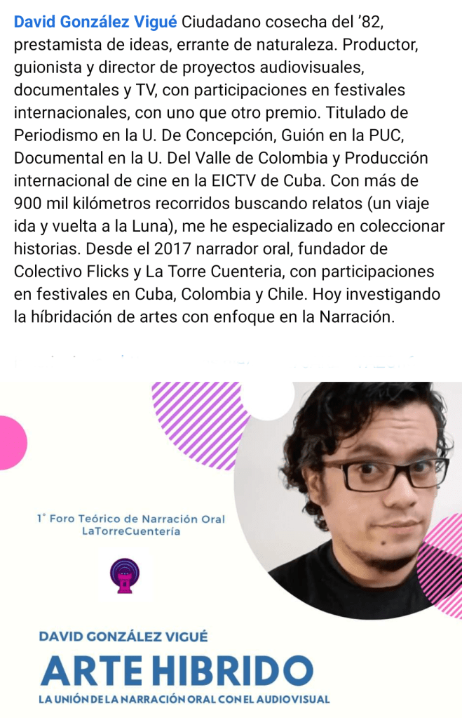 Pude ser parte teniendo un cupo vía Zoom y escuchar atentamente las temáticas. Los tres fueron claros en transmitir sus conceptos. Brindaron bibliografía de apoyo. Nombraron conceptos de Maturana, de Francisco Garzón Céspedes. Hablaron de conectar con la fibra de lo humano, de tocar y conmover; de ir al encuentro de la belleza. Dejaron claro que la Narración Oral es un arte viviente, hablaron de la intimidad conversacional, de la importancia del cuento, del hecho escénico y del espacio escénico. Qué saber escuchar, sería lo más importante a la hora de narrar, de ser respetuoso del público. Se definió el concepto de arte híbrido, se ejemplificó. Se plantearon propuestas para narrar en diferentes plataformas, las que debemos conocer y entender, saber de sus propios códigos, de manejar estos medios audiovisuales para fusionarlos al arte del narrar a viva voz, como en otros tiempos pasó con el libro y el dibujo dando nacimiento al cómics, al libro ilustrado y al libro álbum.