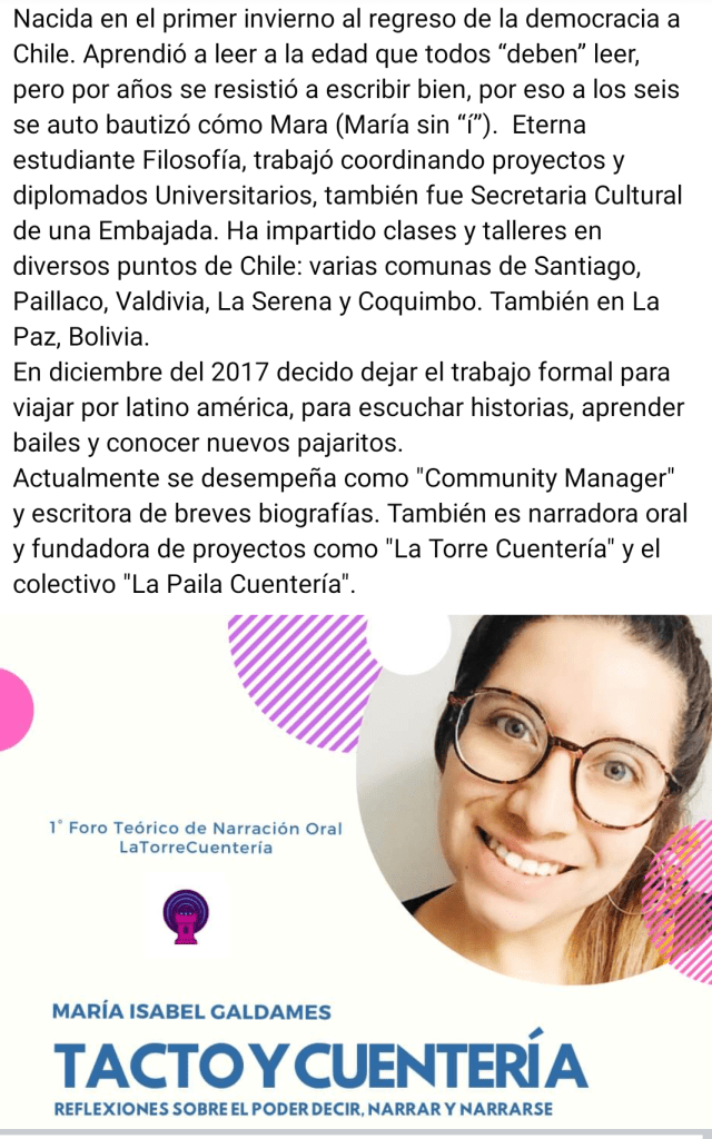 La propuesta tenía como objetivo principal compartir experiencias y reflexiones referentes al campo de la narración oral y, desde ahí, invitar a un debate abriendo preguntas por parte de los asistentes, buscando re-pensar en los temas tratados. Invitando además, al sábado siguente a través de un Live de Instagram, a un conversatorio con el fin de permitir crecer en conjunto. El Live quedó en el IGTV.