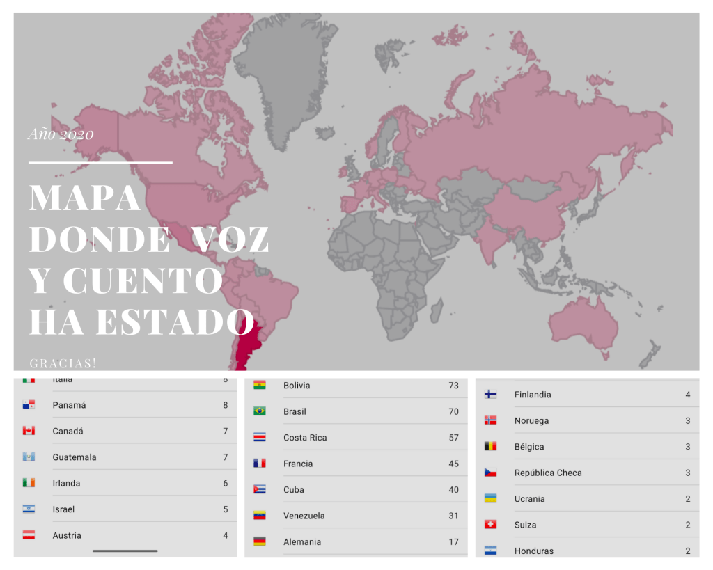 Las notas se han leído en distintos países del mundo. No imaginé la cantidad de narradores de distintos lugares del mundo que me ofrecieran sus palabras y su tiempo en las entrevistas y para la sección Viajamos a… Nos cuenta… Sección que continuaré este año para seguir viajando a distintos países en las voces de los protagonístas: los narradores.