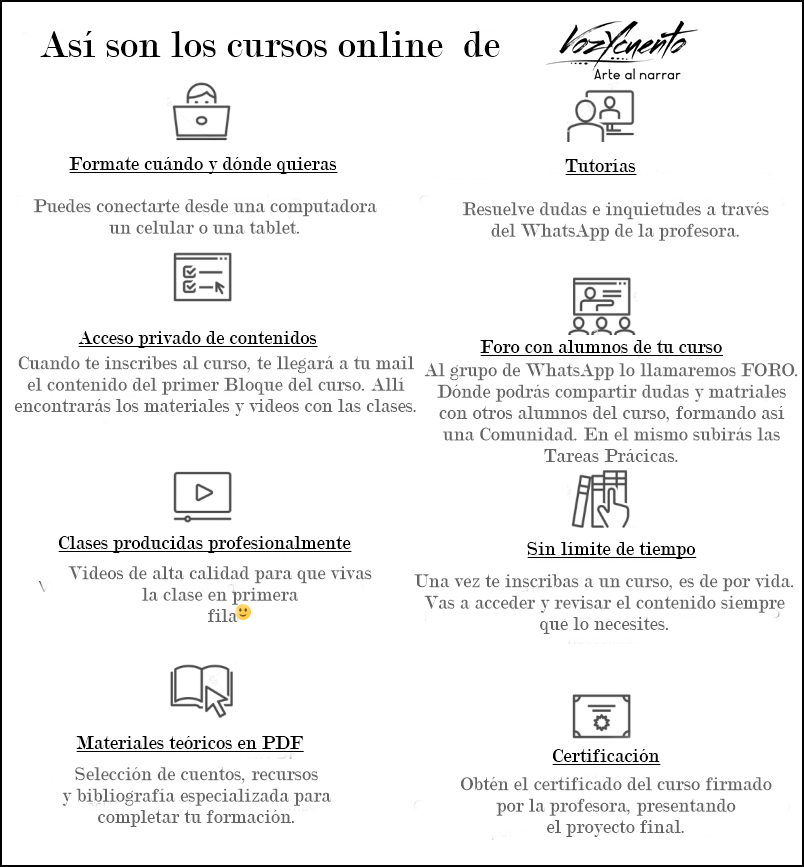 INFORMACIÓN: En el Laboratorio – Taller «Mejora tu cuento». ¿Sabías que se aprende a narrar narrando? ¡Sí!, Este el el lugar preciso para hacerlo, aquí, participarás narrando un cuento para luego de una forma colaborativa y respetuosa te ayudaré haciendo sugerencias para mejorarlo . Nos detendremos en los recursos y las estructuras narrativas del texto, para darle forma a tu voz única. Buscaremos las emociones que despierta tu cuento. Enriqueceremos la narración con diferentes formas de usar la voz , el ritmo y la intención, dando algunos tips a tener en cuenta. También haremos algunos ejercicios especiales con el texto elegido y alguno similar. Al terminar la clase se te enviará el video para que lo veas las veces que quieras.