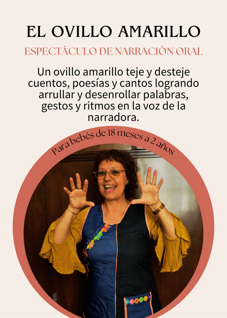 Temática: Sesión de narración oral de cuentos, rimas, poesías y canciones donde se van tejiendo palabras a partir de un ovillo amarillo.